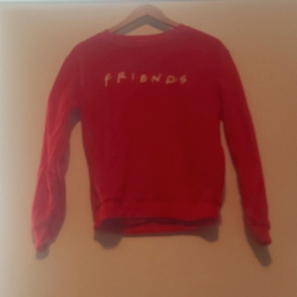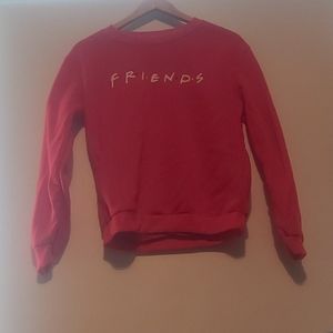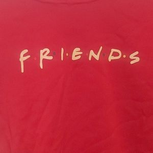 Red sweatshirt with Friends across the chest in white capital letters. Size large.