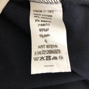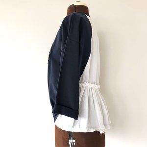 Sweatshirt inspired top has sequin heart motif, extended shoulders. drawstring hem in the front. Contrasting back is polyester with elasticized waist. Sleeves are 3/4 length with cuffs.