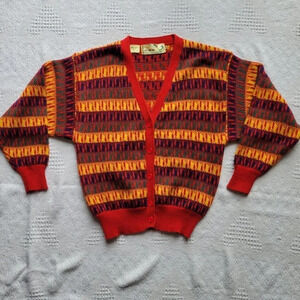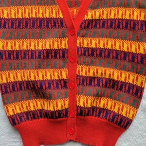 A mix of beautiful bright colors with big red buttons, 100% acrylic knit button up cardigan.