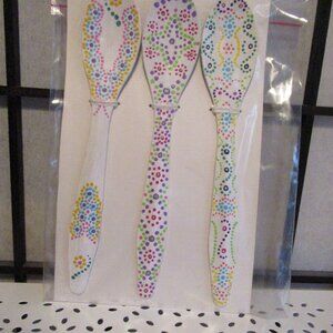 Each spoon measures 7.25″H x 1.25″W, Aspen Wood, Acrylic paint w/ acrylic high gloss glaze.