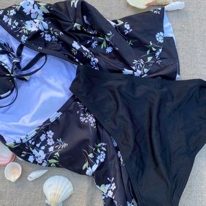 Sweet Floral print Halter Tankini with Peplum Black Bottoms