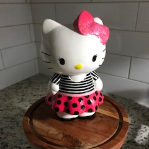 Isn't she adorable - this Hello Kitty bank is in great condition. Could just be used as decor item but has ability to be used as a bank. Colours are nice and vibrant. Size is approx. 8"H X 4"W.