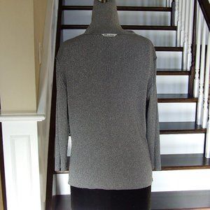 Nice stretchy sweater by "Nygard Collection''. Amazing details, zipper closure (double zipper, you can open from the bottom as well), silver overtones with a bit of a sheen, and a lovely lace finish at the zipper.