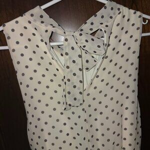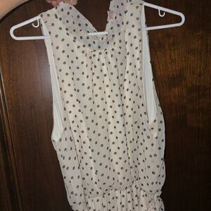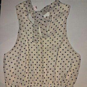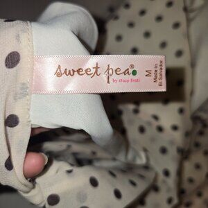 This is a chic and stylish polka-dot sleeveless dress only worn ONCE from Sweet Pea by Stacy Frati, size Medium. Made in El Salvador, it features a lightweight, breathable fabric perfect for casual outings, summer events, or layering in cooler weather. The dress includes an adjustable belt to define the waist and add a feminine touch. The soft, cream-colored base with classic black polka dots offers a timeless and versatile look.