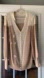 This elegant vintage cardigan features a beautiful cream and tan color combination. Pleated sleeve with wide cuff. Embroidered. Row of 15 small mother of pearl buttons along the front. No flaws - like new. Very soft. Luxurious - has weight to it. Small shoulder pad which can easily be removed. All buttons intact. One of a kind very feminine piece!