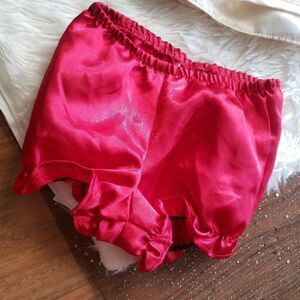 Features: Ivory layered dress with a red satin bow. Has buttons in the back. Comes with matching red bloomers.