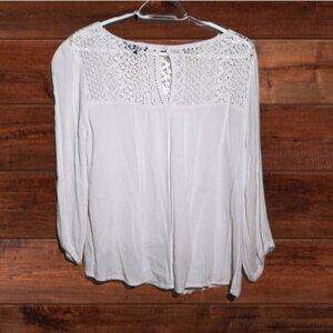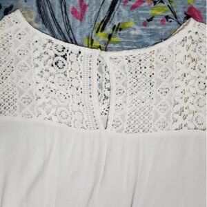 Soft Flowy Lace embroidered top with sweetheart neckline and back button closure.