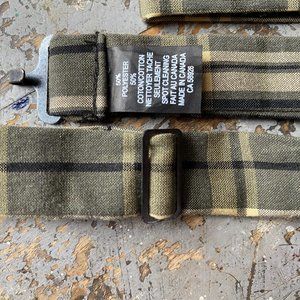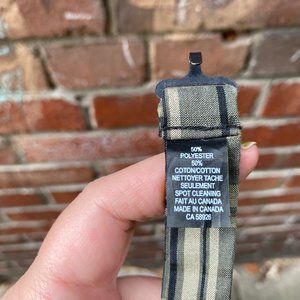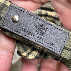 Never-worn unique bow tie with wood button detail, handmade in Old Montreal by Swell Fellow. Adjustable strap goes from 14 to 19.5 inches. Soft 50/50 poly cotton blend. Plaid pattern in tan (sand? latte?) and black with shades of charcoal grey.