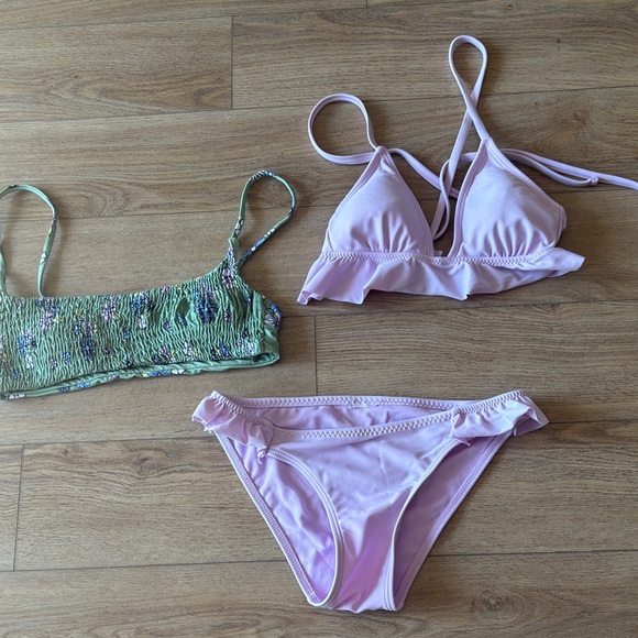 Stylish lavender bikini set (XS) with a green floral swim top (Size M feels like XS, from Simon’s). Perfect for beach days.