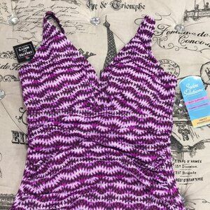 With the look of a two-piece and the coverage of a one-piece, this sleek swimsuit from Swim Solutions features flattering tummy control, a sleek V-neck and a playful printed top.