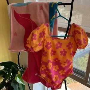 Summer may be ending, but swim lessons or sunny holidays never! Cute little size 2 -3 girls lycra bathing suit, with a complimentary (that means free) hooded towel!