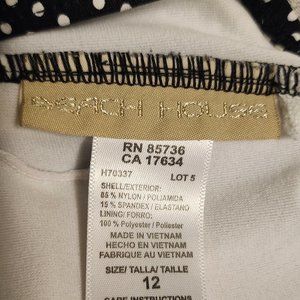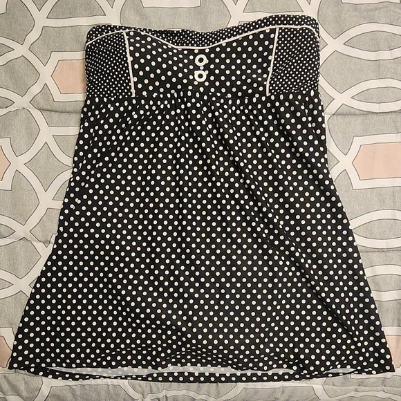 One piece strapless swimsuit that looks like a dress. It is a size 12 and is very flattering, It has been warn a couple of times.