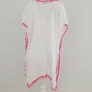 Very pretty caftan tunic cover up in a soft gauzy white polyester with cute pom pom trim in candy pink.