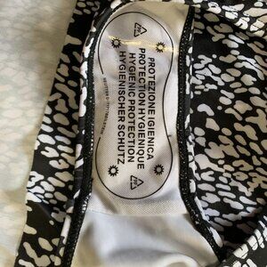 Beautiful black and white print - halter top style. Self-tie straps. SPF 45 Protection. Removable soft cups.