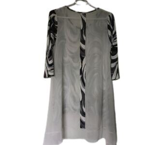 It is a tunic-length blouse with an abstract black, white, and gray pattern on the upper part, and a sheer white fabric at the bottom, creating a high-low or asymmetrical hemline. Longer in back. The brand "SWISH" can be seen on the label.