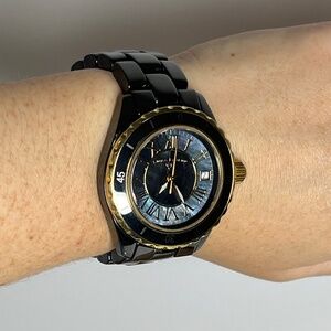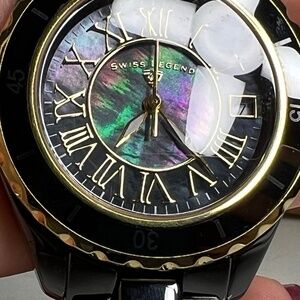 Elevate your elegance with the Swiss Legend Karamica Women’s Black Watch, a blend of sophistication and functionality. Featuring a sleek ceramic case and band, this timepiece boasts a chic black dial accented with Roman numerals and a mesmerizing Mother of Pearl face. The gold bezel adds a touch of luxury, making it a perfect accessory for any dressy occasion.