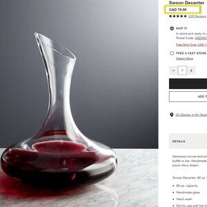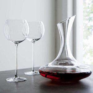 Sensuous curves and an angle-cut rim stand out at the table, buffet or bar. Handmade carafe allows wines to breathe and pours like a dream.