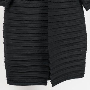 This coat from Sybilla is crafted in a black felt pieced together in stripes with alternating raw-edge seams, and features long balloon sleeves, a shawl collar, and front hook closures.