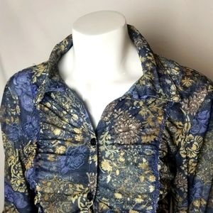 Beautiful blue and yellow floral printed blouse, light weight with a gathered ruffled front.