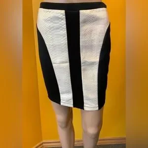 Black & Cream Midi Skirt. Two front cream panels are a pleather feel alligator print. 96% Polyester, 4% Spandex Size Medium 28” Waist, 17” Length