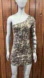 Elegant one-shoulder dress with cut-out sleeve design. Features a stylish pattern in gray and cream. Ideal for evening wear.