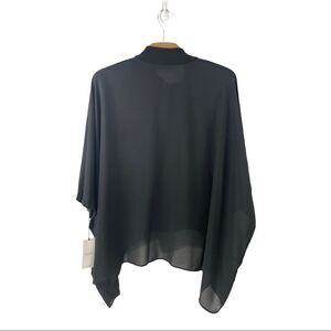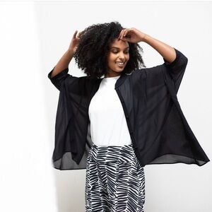 Elegant black button down shirt. Asymmetrical hem. Perfect for versatile styling.