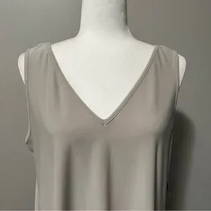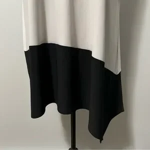 Scoop neck on one side and a v-neck on the reverse. Side slits at hem.
