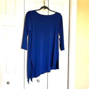 Rich Cobalt Blue Nu Focus Asymmetrical Hem Tunic is a relaxed fit that falls at all the right angles! Angled hem features side slits. Angled neckline features bra friendly cut-outs at shoulder. Three-quarter-length sleeves. Made in their signature soft jersey fabric of 94%Polyester 6%Spandex. Hand wash, lay flat to dry. Proudly Made In Canada. Size 10. Approx flat measurements: Bust19” Waist18.5” Hip22” Sleeve17.25” Shoulders14.5” Length26.5 at centre. No wear on this garment, no flaws.