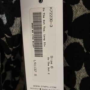 Sympli top in the On the Dot french terry jersey fabric. Size 6. A very flattering top with a scoop neckline and draped cowl with three oversize buttons. A very flattering and flowing fit A line fit -- the back length is slightly longer than the front. The jersey fabric is oh so soft and comfortable. Never worn, brand new with tags.