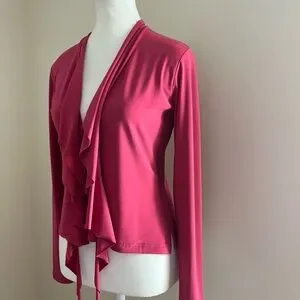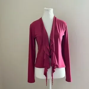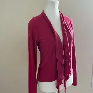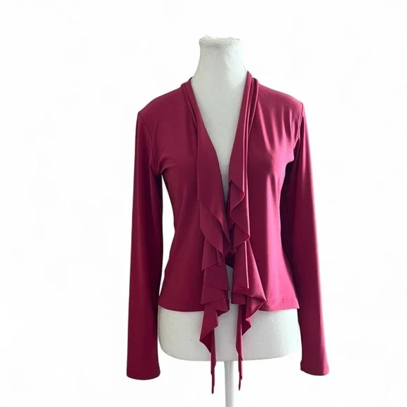 Soft knit cardigan with cascading ruffle trim. Open front design for easy layering. Stretchy fabric for comfortable wear. Vibrant raspberry hue adds a pop of color.