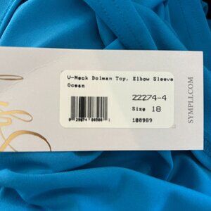Never worn, new with tags. Sympli V-Neck Dolmon Top Elbow Sleeve in a beautiful blue -- Ocean. Look up pictures on line -- This is model 22274-4. Size 18, seems like a loose fit. From experience, Sympli's tops are comfortable, easy to care for, and look good for a long time. The size chart says Bust 47-49 in, Waist 43-46 in, Hips 49-51 in. Great look for spring and summer. Fabric 94% polyester 6% spandex. Made in Canada.