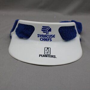 Up for sale is a vintage Syracuse Chiefs visor. It has a white plastic body with a blue terry towel band. It is an in-game promo by planters peanuts and has the planters logo screened on the brim and the Chiefs logo screened on the visor. What a great addition to a baseball collection.