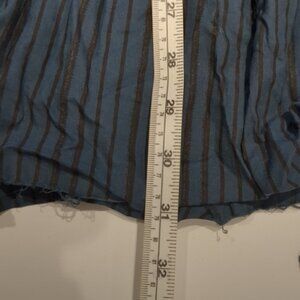 From Ottawa's Kaliyana label, this the Empire Shirt in a blue with black stripes. The photo with the pit-to-pit measurement is the most accurate for colour. This is made from a 100% cotton woven they call Carnaby. It can be worn crinkled, as shown here, or ironed smooth. It has box pleats and unfinished edges at the waist. The hem is also unfinished, so small threads will hang loose. Labelled their size 2, which is a M/L, but very generous in sizing. Please see measurements in photos. Would look good on M, L, XL, 1X, 2X. Ideal for layering.