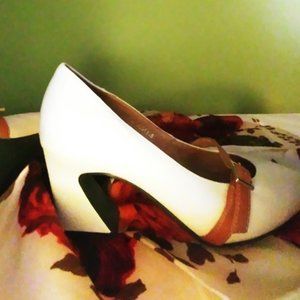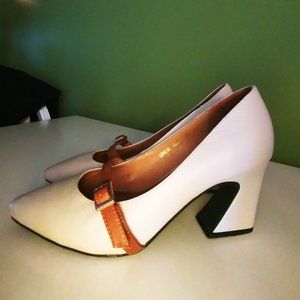 "BELLE" Creamy beige coloured Leather with Tan straps, angled 2" heels, super clean, worn once