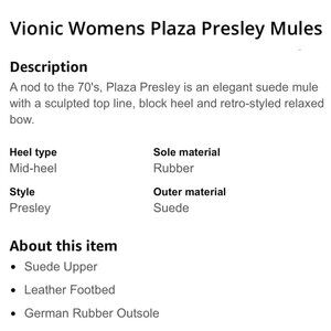 A nod to the 70's, these Plaza Presley's are an elegant suede mule with a sculpted top, square toe, block heel & retro-styled relaxed bow.