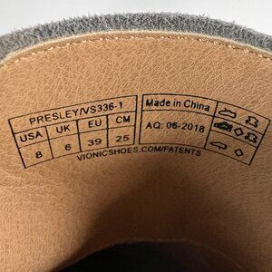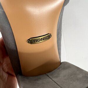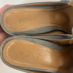 Sz 8- Vionic Plaza Presley Grey Suede Bow Front Square Toe Block Mules Heels Shoes