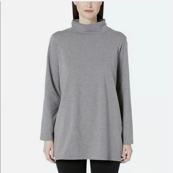 Sz M- Eileen Fisher Funnel Mock Neck Heather Grey Long Sleeve Tunic Top