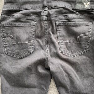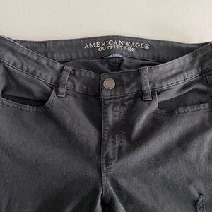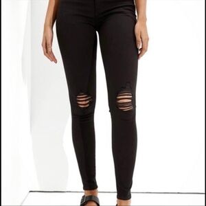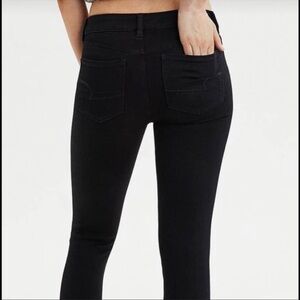 American eagle size 10 xtra long black distressed jegging in EUC. 30” inseam and very comfy to wear. Purposefully distressed at the knees. Cotton, viscose, polyester and elastane blend for easy care. The first 3 images are for inspiration, the listed item is featured in the remaining images.