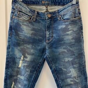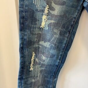 NWOT Condition Kut from the Kloth Distressed Blue Camo print denim crops. Factory distressed fading, tears and crease marks. 5 pocket silhouette and mid to high rise cut. Approximate measurements waist laying flat 14”, Rise 9.5”, 25.5”.