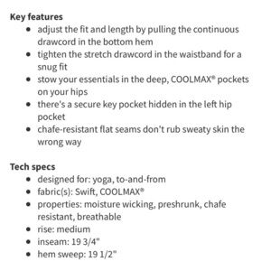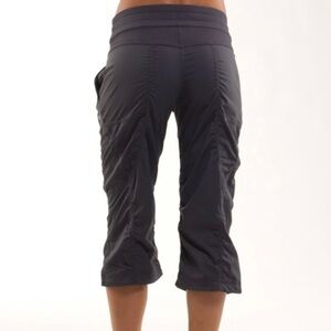 EC Grey Studio Crops by Lululemon. I think the colour is coal. These are unlined. Adjustable waist and hems and 2 deep pockets for stashing your stuff. Made of Swift and Coolmax. Approximate measurements waist laying flat 12.5”, rise 9”, inseam 19.5”. Seams are in great condition. There is 1 tiny snag on the back of the waistband shown in the last image. The first 3 images are for inspiration only and not for sale. The listed item is featured in the remaining images.