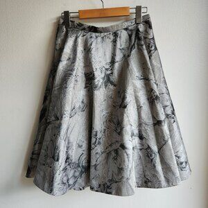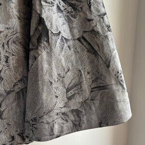 EUC, Ted Baker, A-line skirt, circle skirt, flowy, designer, British, sophisticated, elegant, romantic, feminine, fit-and-flare, shimmer, cocktail, wedding guest, party, date, brunch, office, work, professional, business, casual, weekend, holiday, holidays, ceremony, awards, gala, premiere, red carpet, formal, evening, reception, outings, black tie, dressy, upscale, luxury, premium, premium quality, investment, wardrobe staple, chic, stylish, fashion, vintage-inspired, retro, 50s, swing, twirl, movement, flow, UK, London, fluffy, textured, voluminous, bouncy, fluffiness, silver, shimmering, jacquard, midi, volume