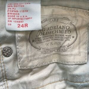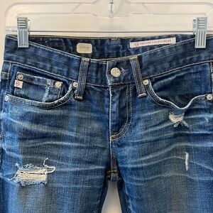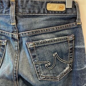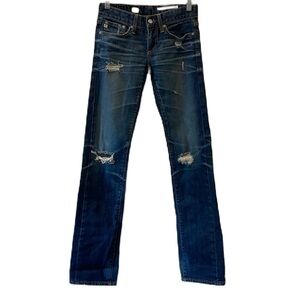 Sz24 Reg AG Tomboy Factory Distressed Denim. Medium wash with whiskered detail front and behind the knees. Tactfully placed holes and areas of purposeful fading. Approximate measurements waist laying flat 13.5”, Rise 7.5”, Inseam 32”. Normal wear on this item, wear on seat shown in last image. The stock image is for inspiration only and not for sale, simply to show the fit of a similar pair.