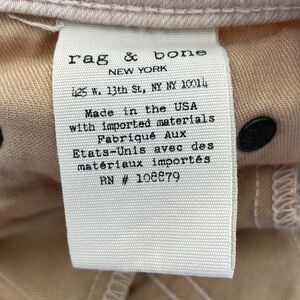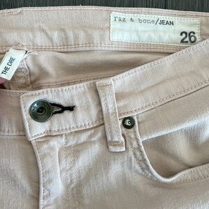 The perfect Jean for spring! Good condition peachy-pink skinny jeans by rag & bone. Look great rolled up or at full length. Approximate measurements waist laying flat 14”, rise 8”, inseam 30”. The first 4 images are for inspiration only and not for sale. The listed item is featured in the remaining images. Normal wear on this item.