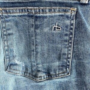 VGUC rag & bone crop denim in a factory faded and distressed Medium blue wash. Purposefully placed holes and cuts meant to fray the more you wash and wear them. Slight whiskering on front. Dip dyed, raw edge hem. 98% Cotton, 2% Polyurethane. Approximate measurements waist laying flat 15”, Rise 8”, Inseam 27.5”. The first 5 images are for inspiration only and not for sale. The listed item is featured in the remaining photos. There is a faint and tiny blemish that isn’t really noticeable on left front shown in last photo. Normal wear and pilling on seat indicative of usage.