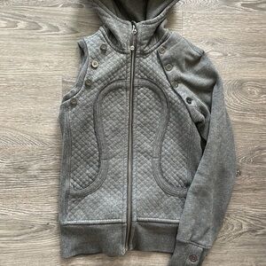 ***Rare***Special Edition Lululemon Scuba hoodie with detachable sleeves, turning it in to a versatile vest. A gorgeous quilted deep coal bodice and lined hood with smooth fabric on the sleeves. Sleeves have a 3 button closure and thumb holes and are in great condition. Minor generalized pilling consistent with age. Approximate measurements pit to pit 16”, Length 24”, arm length from neck seam 30”. The first 8 images are for inspiration only and is not the item for sale. The remaining images are of the listed item. The listed item is deep coal in colour, not black and white shown in the first 2 images.