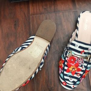 Striped blue and white with flower stitching and some tasteful bling . Great used condition from Aldo’s . Pair up with white ensemble for winter getaways.