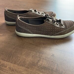 Sz6.5 Timberland Leather flats with perforated uppers in GUC Some dirt and discolouration on side walls of soles, otherwise great condition. A nice neutral brown colour. Leather insoles. First 3 images are for inspiration only and not the item for sale.The remaining images are of the listed item.