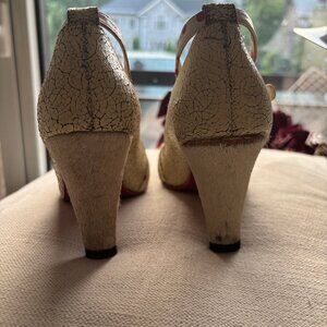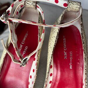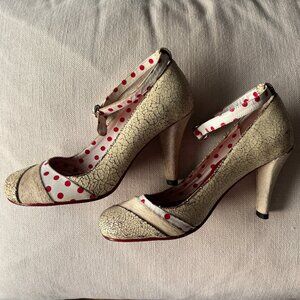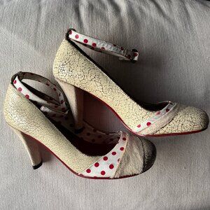 From the British brand Irregular Choice, fun red and cream leather shoes with a polka-dot trim and straps, plus pony-hair panels on the front and wrapping the heels. Also feature cute round toe, cracked-finish upper, adjustable ankle strap, and mid-height 3.5" heel.