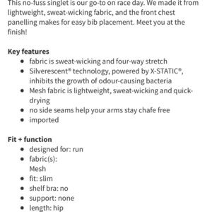 VGUC Lululemon Singlet. I am estimating to be a size 8 by measurements so please read the following carefully. Designed for run from Silverescent fabric to reduce bacterial growth, this is sweat wicking and quick drying mesh based. The fit is meant to be slim and has no shelf bra or support. Approximate measurements laying flat pit to pit 15.5”, Length 24”. I wear a size 12 and it does fit, although tight, I estimate to be a size 8. The first 4 images are for inspiration only and not for sale. The listed item is featured in the remaining images. Minor thread pilling generalized on front horizontal seam, consistent with wear and shown in the last picture.