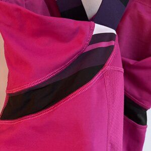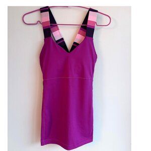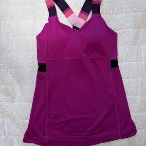 Lovely Lululemon raspberry pink color with gradient straps in purple, black, white and pink. Built-in bra and cross-back design. Size 8.